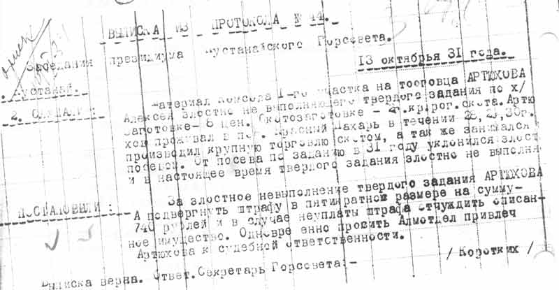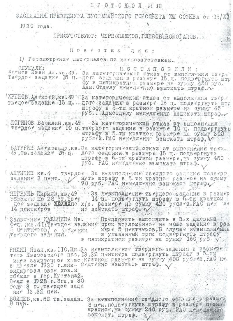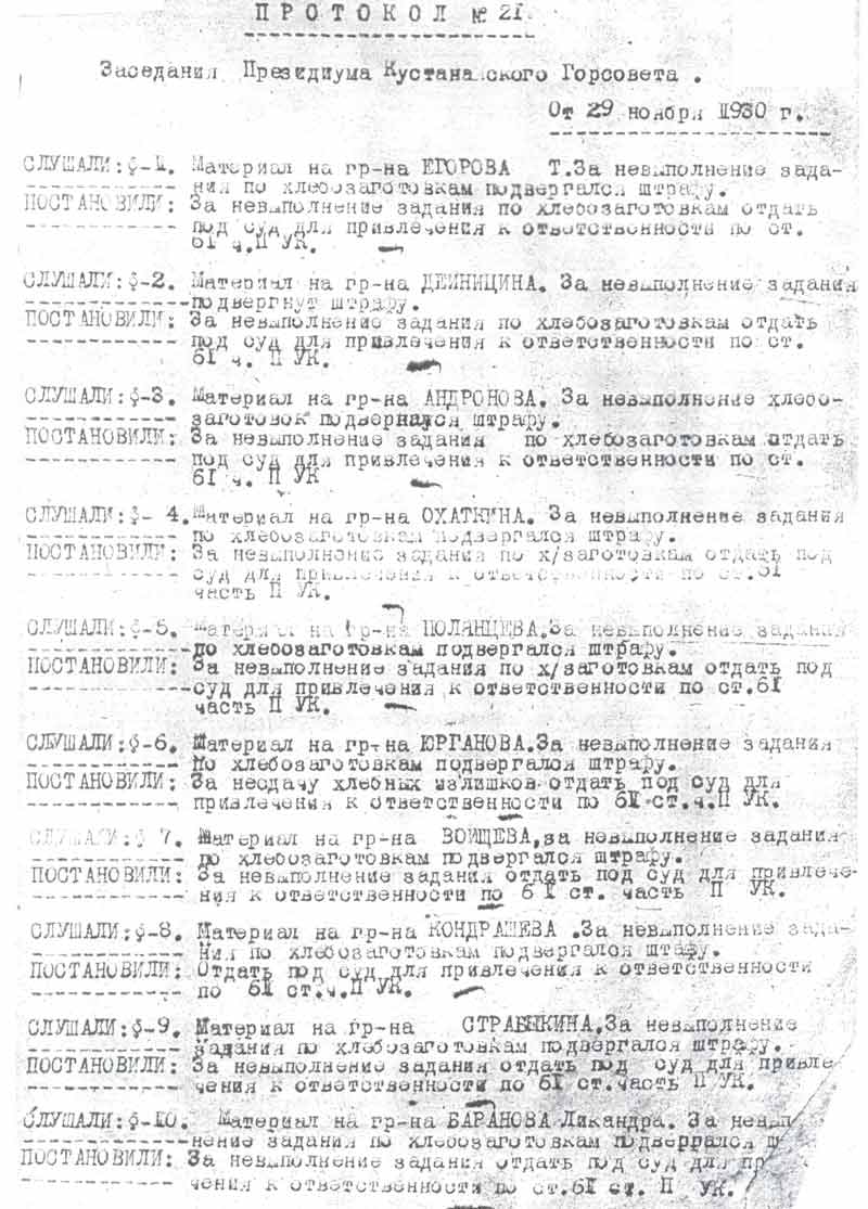 Постановили: «За невыполнение задания по хлебозаготовкам под суд ст. 61, II УК» - таких решений было принято по 73 человекам. Например, «Слушали материалы на гражданина Кузнецова Никифора за невыполнение заданий по хлебозаготовкам, подвергался штрафу. За не выполнение задания отдать под суд для привлечения к ответственности». 124