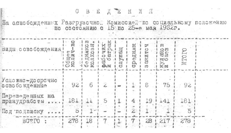В 30-е годы органы и организации допускали беззаконие и перегибы. Мы нашли в архивах документы, признающие эти шибки: «Необходимо отметить, что в отношении применения репрессий мы имели резкие перегибы, что видно из нижеприведенных данных. На основе решения Бюро Обкома от 16 апреля с/г по докладу товарища Сольц, постановлением Бюро РК ВКП (б) была создана комиссия по пересмотру дел заключенных, в которую введены: прокурор, председатель райисполкома и председатель КК, РКИ, которая приступила к работе с 30 апреля» - говорится в этом документе. В основе руководства комиссии по разгрузке Кустанайской ИТК было взято решение Обкома от 16 апреля 1932 года. В выполнении указаний Обкома по вопросу о революционной законности был пересмотрен состав заключенных в ИТД. До работы комиссии по разгрузке, Кустанайский ИТД на 1 мая 1932 года имел заключенных 1047 человек: в них 194 следственных и 54 пересыльных. Из числа 799 человек, осужденных находилось: кулаков и баев 592 человека, зажиточных 66 человек, деклассированных элементов 14 человек и остальных трудящихся (бедняки, середняки, колхозники и служащие) 127 человек.119 В результате работы комиссии освобождено из Кустанайского ИТК: досрочно - 39 человек, переведено на принудительные работы – 101 человек, освобождено под подписку – 1 человек, сослано без контроля – 40, всего – 181. По социальному положению: рабочих и батраков – 6 человек, бедняков колхозников – 50 человек, середняков – 23 человека, зажиточных – 57 человек, кулаков и баев – 40 человек, служащих – 5 человек, всего – 181 человек.120 Имели место задержки разбора материалов на следственно-заключенных до 18-19 месяцев. Разбор шел быстро, оперативно и не всегда объективно. Поэтому была создана разгрузочная комиссия, которая пересматривала наспех решенные дела. Вот сведения:
