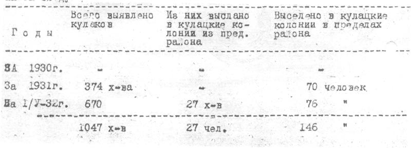 Кулацкие элементы Кустанайского района с городом Кустанаем были взяты на учет. В Костанайском областном архиве сохранились книги записи кулацких элементов. По этой книге их числятся 1507 человек. Все они подлежали раскулачиванию. Из них было сослано: кулаков – 366, лишено свободы – 219 человек, в т.ч. середняков лишено свободы – 43 человека, бедняков – 1, колхозников – 9, должностных лиц – 62 человека.116